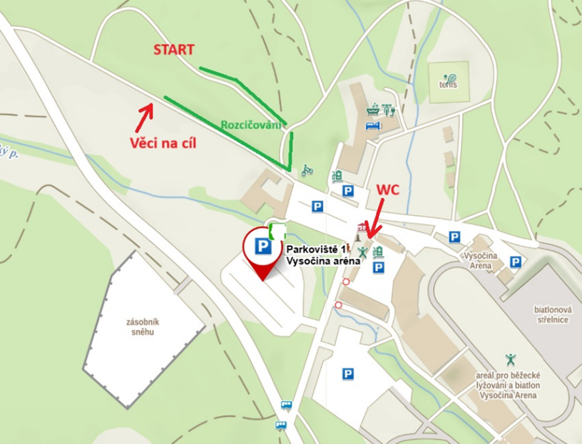 V cíli bude zveřejněna trasa povinné cesty zpět na parkoviště. Závodníci mohou opustit cílový prostor směrem k parkovišti nejdříve v čase 70. Vzdálenost z cíle na parkoviště do 2 km. Ve Vysočina Aréně budou probíhat dětské běžecké závody a další tréninky. Nevstupujte na závodní tratě Vysočina Arény (bude probíhat trénink lyžařů na kolečkových lyžích). Dodržujte fair play.