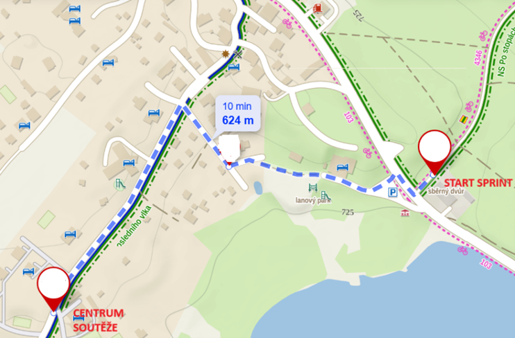 Cesta na start individuálně dle mapky níže, vzdálenost 700 m. Rádia musí být odevzdaná v prostoru startu nejpozději v 16:00. Všichni závodníci musí být v prostoru startu nejpozději v čase 17:00.